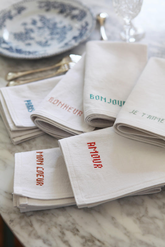 Serviettes brodées *Bonjour Amour". lot de 2 serviettes. Pièce uniquePrix habituel 45,00 €Prix habituelPrix unitaire / par-
