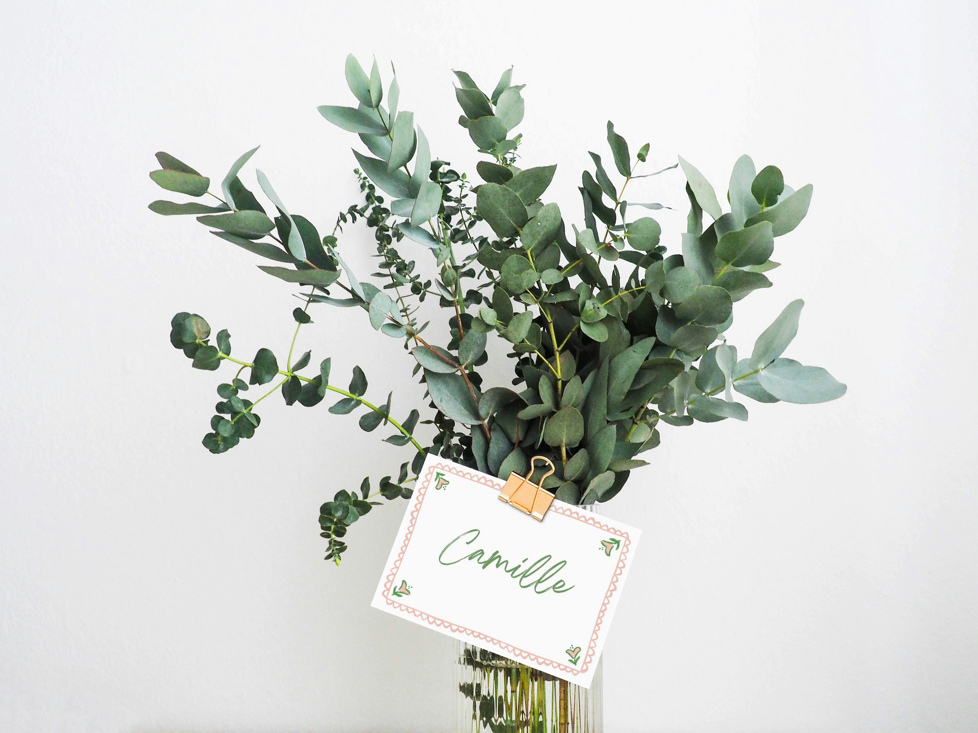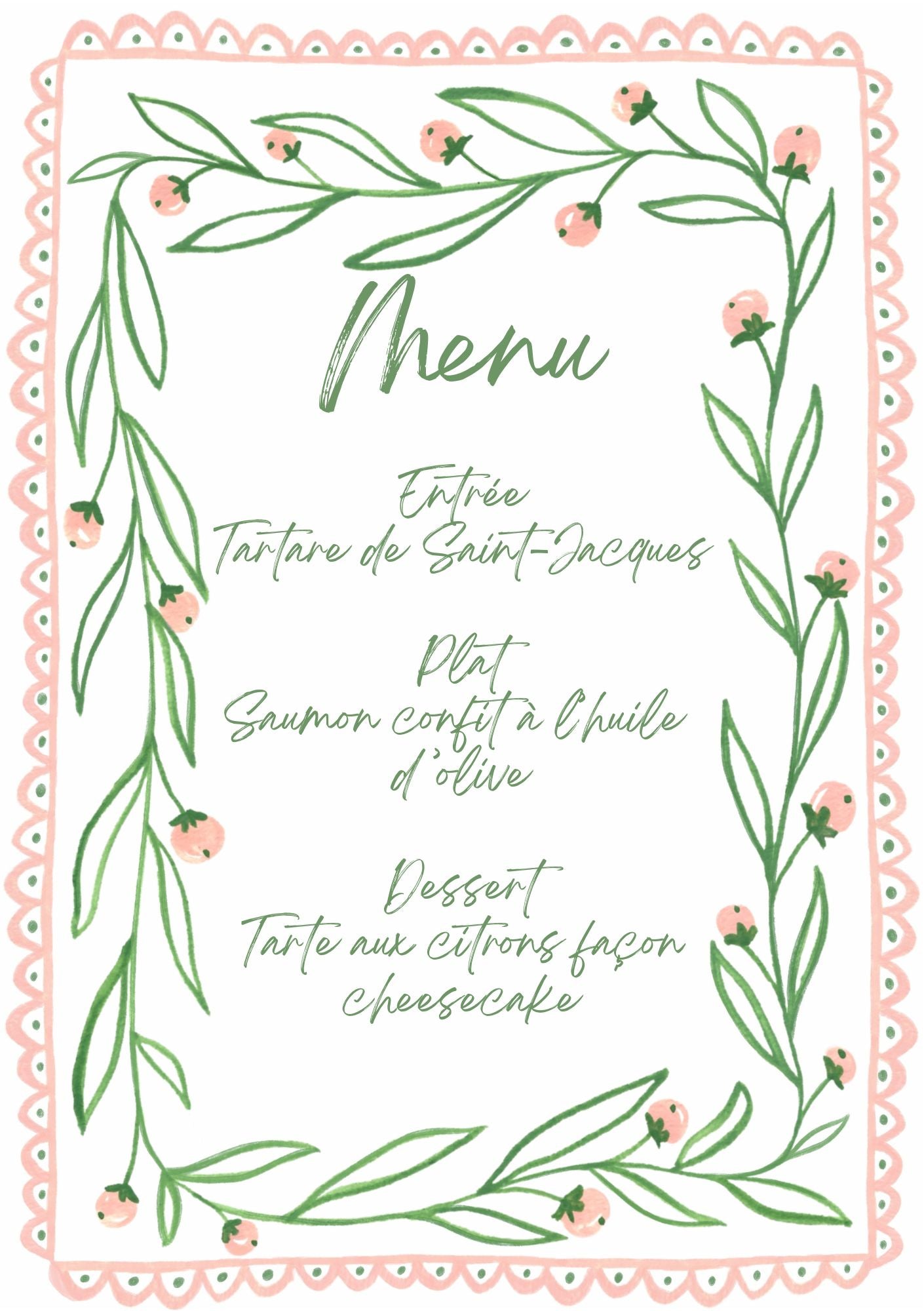 Menu et marque-places Aubépine vert et rose.